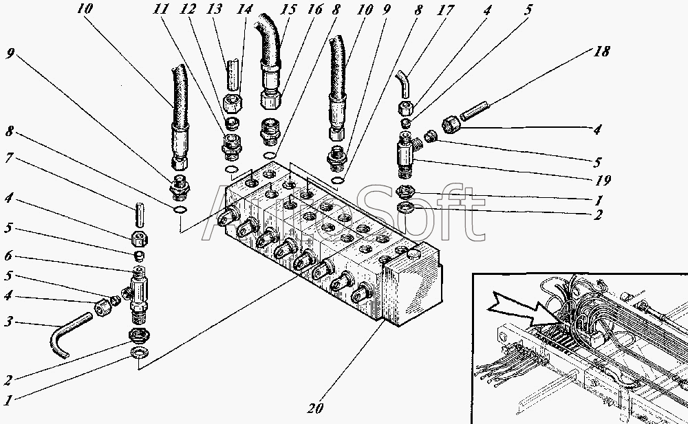 Каталог запасных частей к технике: Коммаш КО-440-4. Монтаж гидросистемы надрамника КО-440-4.26.20.000