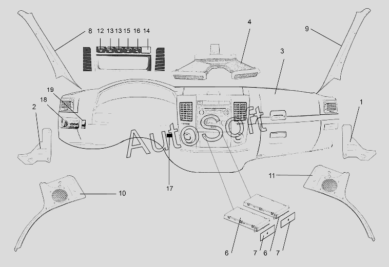 Каталог запасных частей к технике: ЗЗГТ ГАЗ-34039 (Ирбис) (2015). Приборная панель (торпеда), обивка передних стоек изнутри