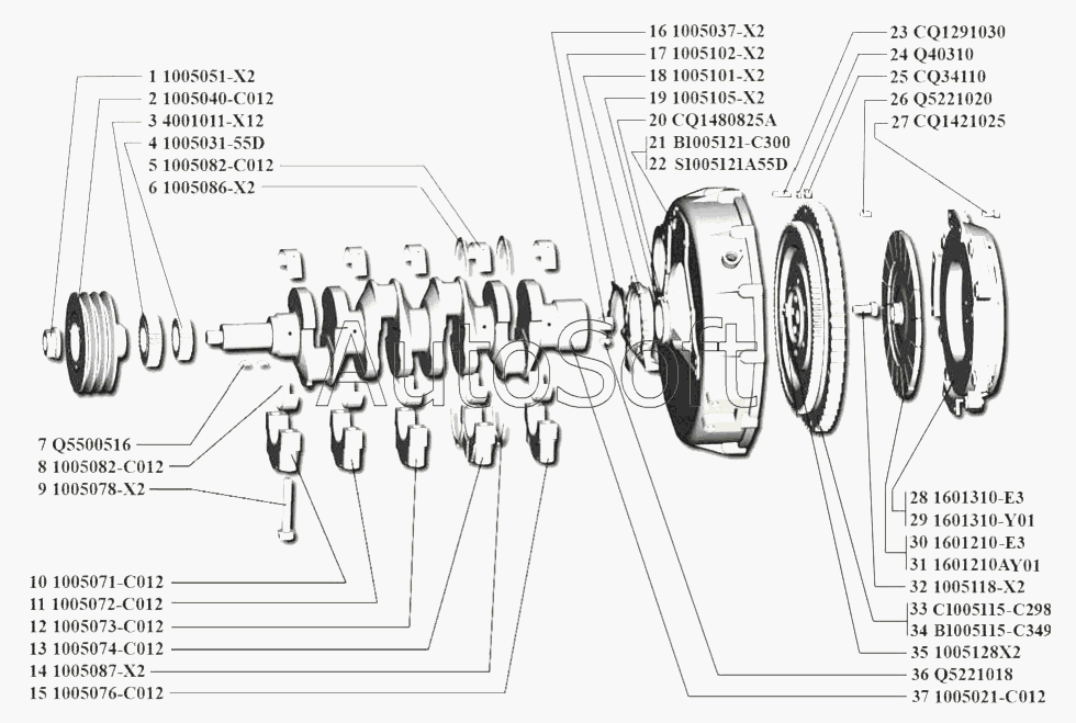 Каталог запасных частей к технике: BAW Двигатели BAW-CA4DC2 (2010). Вал коленчатый и маховик двигателя